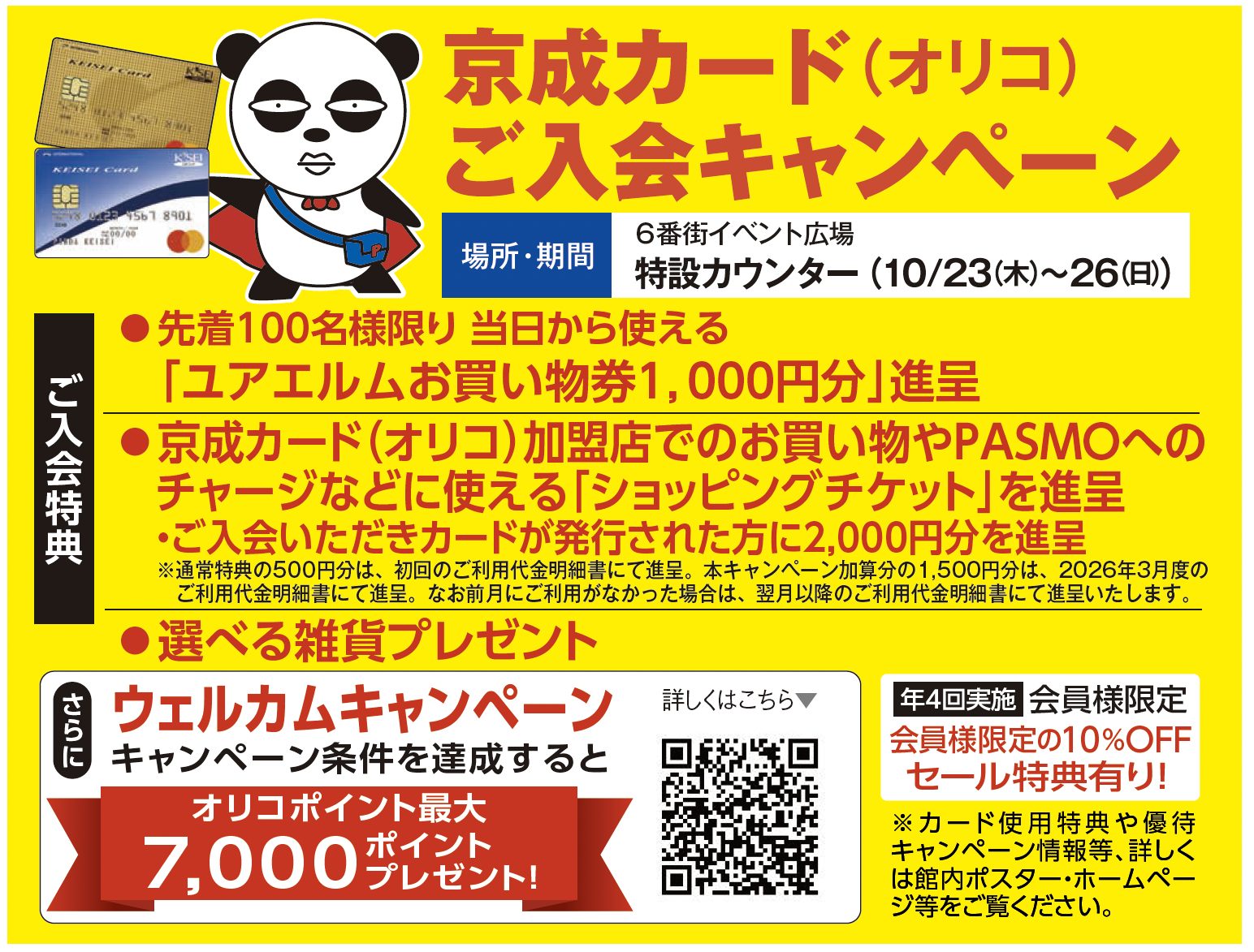 京成カードオリコ 入会キャンペーン! 10月23日(木)~10月26日(日)の4日間、6番街イベト広場におきまして、京成カードオリコ入会キャンペーンを実施しております。 今ご入会頂きますと、先着100名様…