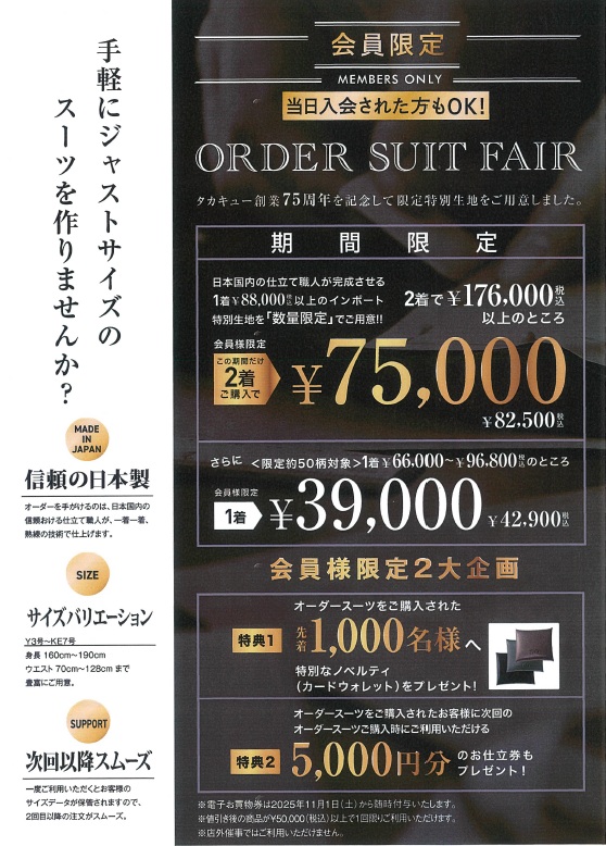 会員様限定 オーダースーツフェア開催!! 6番街 タカキューにおきまして、オーダースーツフェアを開催致しております。 創業75周年を記念して限定特別生地をご用意致しました。 サイズも豊富にご用意しております…