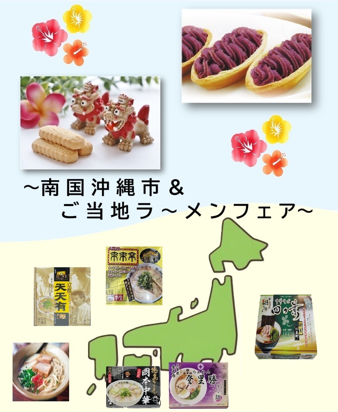 6番街イベント広場におきまして、「南国沖縄市&日本全国ご当地ラーメンフェア」を開催!! 沖縄の代表食材の沖縄そば・ちんすこう・海ぶどうを中心にバラエティ豊富に取り揃え、沖縄の味をお届け致します。また、沖縄をはじめ、日…