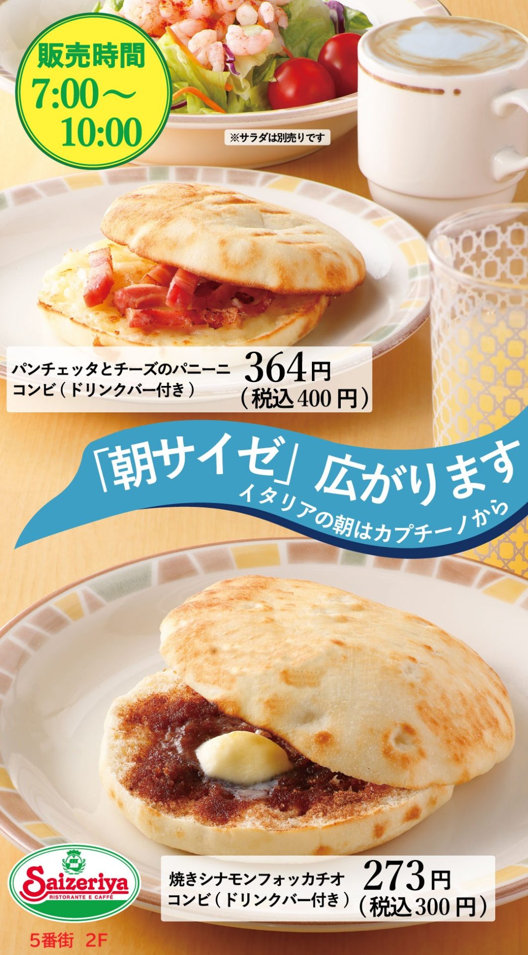 「朝サイゼ 始めました!」イタリアの朝はカプチーノから・・・7:00~10:00まで朝サイゼメニューが始まりました。焼きたてのフォッカチオやパニーニ、ドリンクバーやポテトと一緒に楽しめるお得な「コンビ」や「…