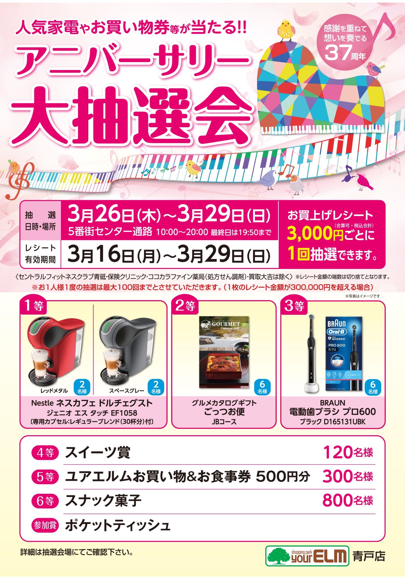 「37THアニバーサリー大抽選会」 人気家電やお買物券等が当たる!! レシート有効期間:3/16(月)~3/29(日)抽選日:3/26(木)~3/29(日) 10:00~20:00 最終日は19:50までユアエルム青戸(…