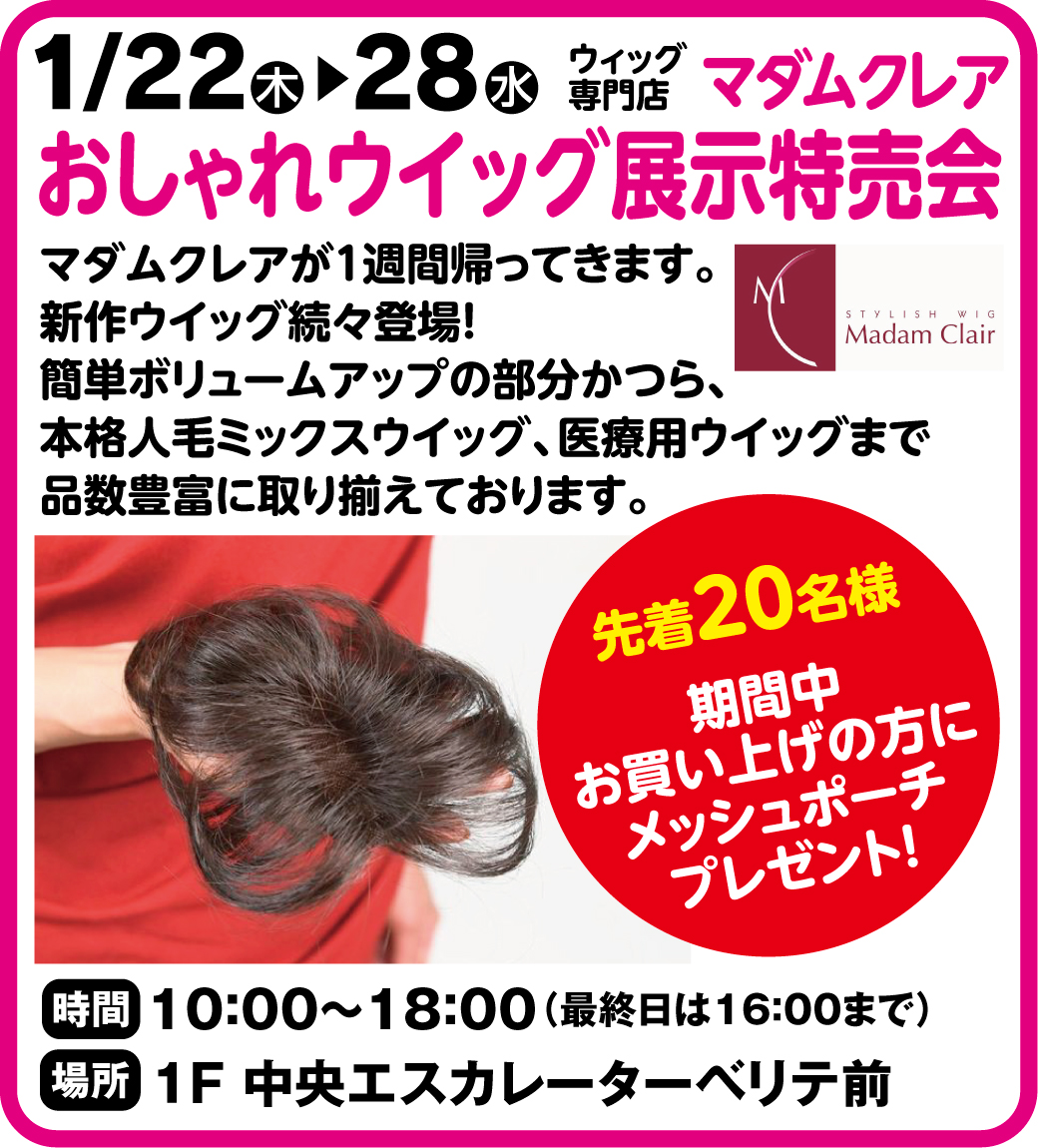 1月22日~28日 ウィッグ専門店(マダムクレア)おしゃれウイッグ展示特売会