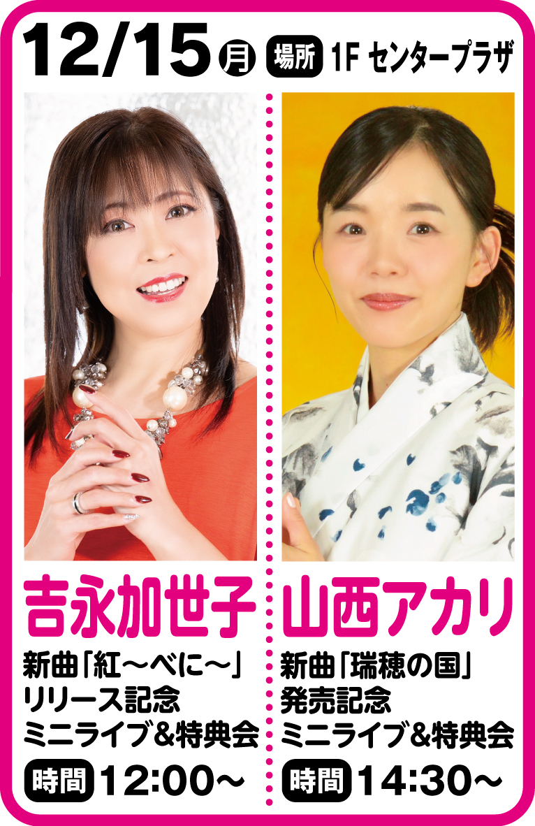 開催日 2025 年12月15日(月) 14:30〜 会場 1Fセンタープラザ (観覧フリー/観覧多数の場合制限あり) 【参加方法】ミニライブの観覧はフリーとなりますが、ステージ前の着席観覧エリアは定員に達した場…
