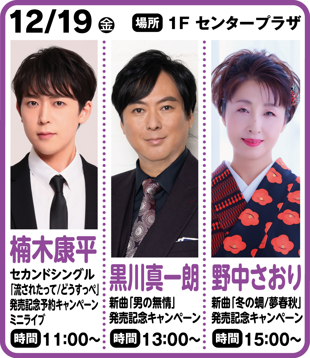 【日時】●12/19(金)13:00~ 【会場】1Fセンタープラザ 【イベント内容(各会場共通)】 歌唱ステージ&特典会 【対象商品】 ★2025年12月3日発売黒川真一朗「男の無情/北の終着駅」 TKCA-91669…