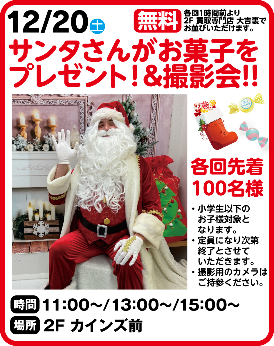 開催日:12月20日(土) 11:00~/13:00~/15:00 会場:2Fカインズ前 各回先着100名様 参加無料 各回1時間前より、2F買取大吉様裏にて お並びいただけます。 小学生以下のお子様対象となります。 定…