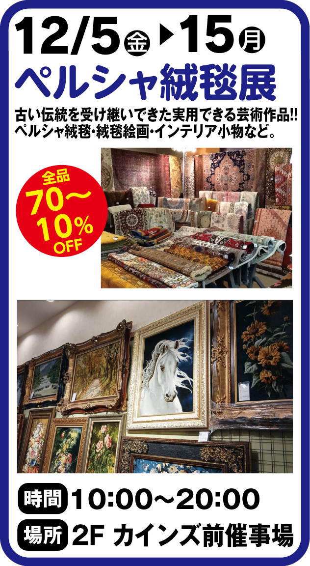 ・催事名:ペルシャ絨毯展 ・期日:12/5~12/15 ・時間:10:00~20:00 ・場所:2F カインズ前催事場 ・コメント:古い伝統を受け継いできた実用できる芸術作品!! ペルシャ絨毯・絨毯…