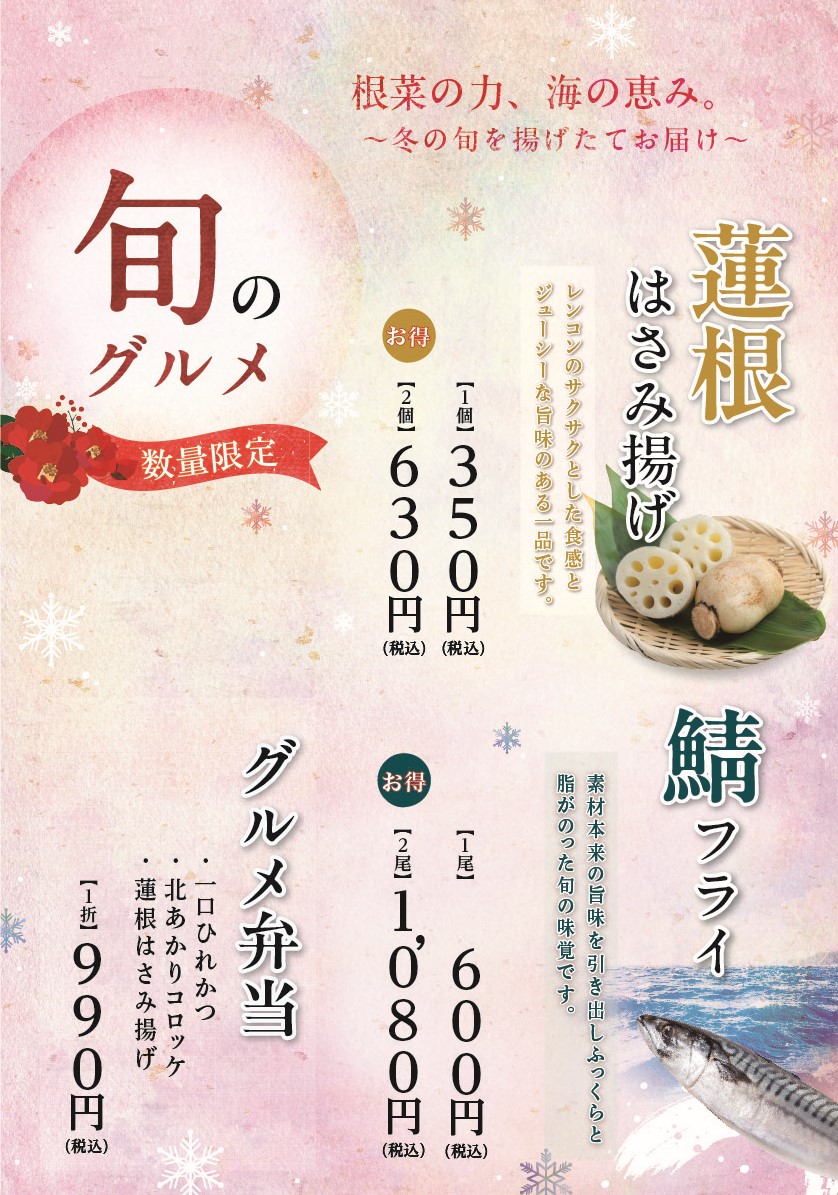 冬の食材にマッチした商品が販売しております。 根菜の力 ★ 蓮根はさみあげ 蓮根の食感が楽しめジューシーなお肉をはさんだ旨味のある一品です。 海の恵 ★ 鯖フライ 鯖の旨味を引き出した調理で脂が乗った旬の味覚…