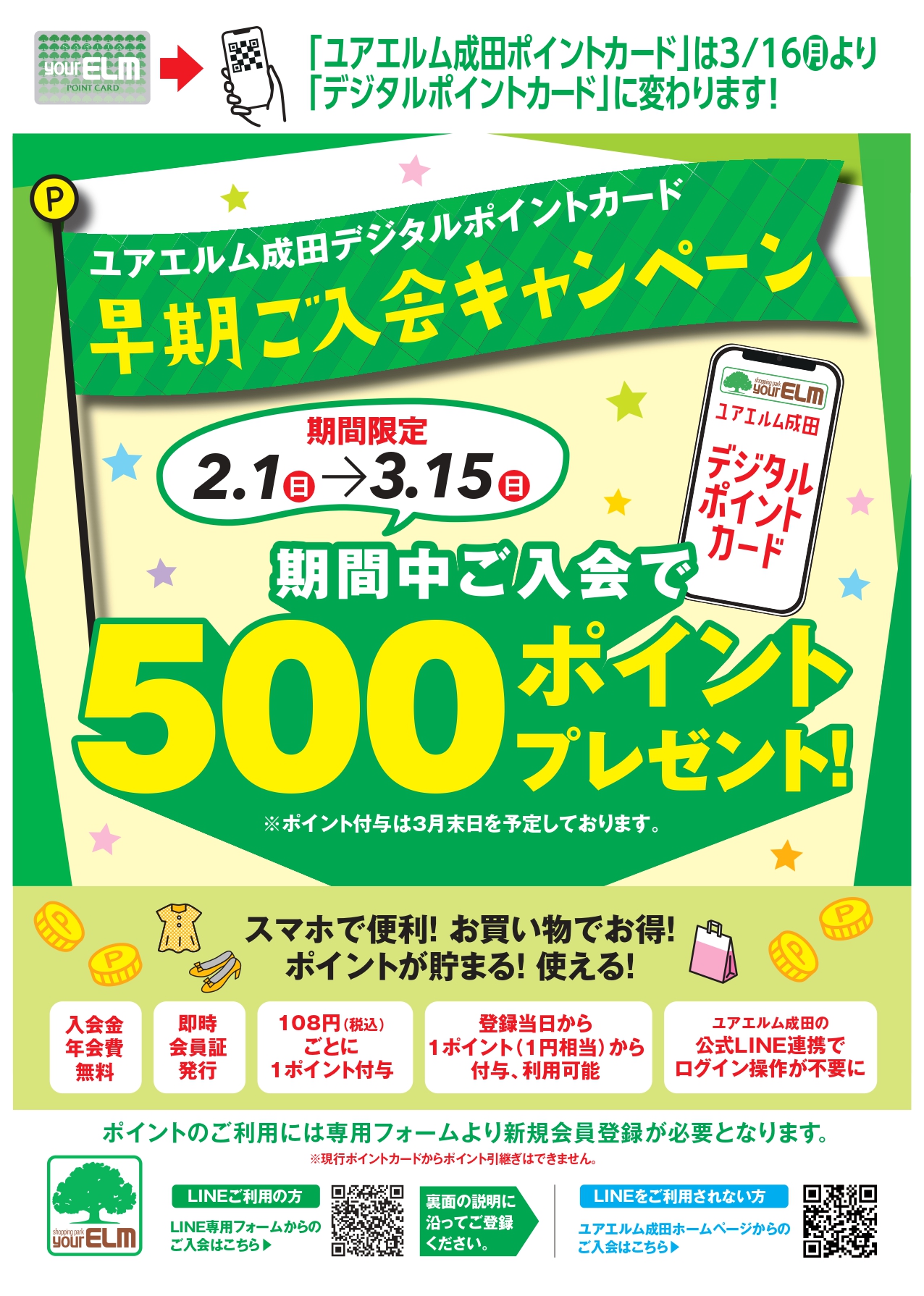 ユアエルム成田ポイントカードは3/16(月)より、デジタルポイントカードに変わります。 期間限定 「デジタルポイントカード」早期ご入会キャンペーン開催いたします!! 【期間】 2/1(日)~3/15(日) 期間中ご入会で…