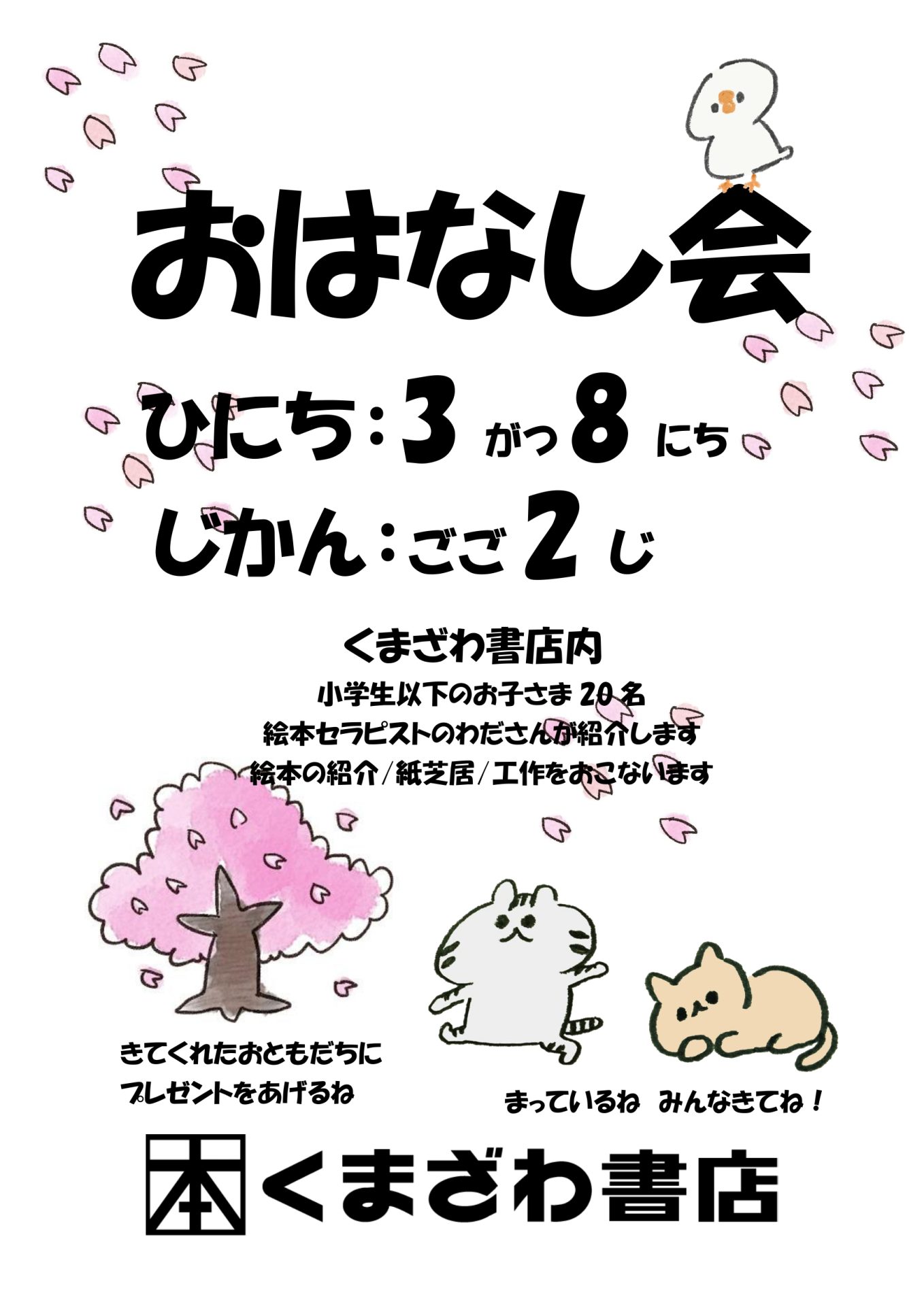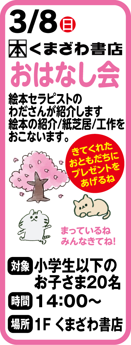 3/8(日) くまざわ書店 おはなし会(くまざわ書店) 対象:小学生以下のお子様20名 時間:14:00~ 皆様のご来店を心よりお待ちしております。