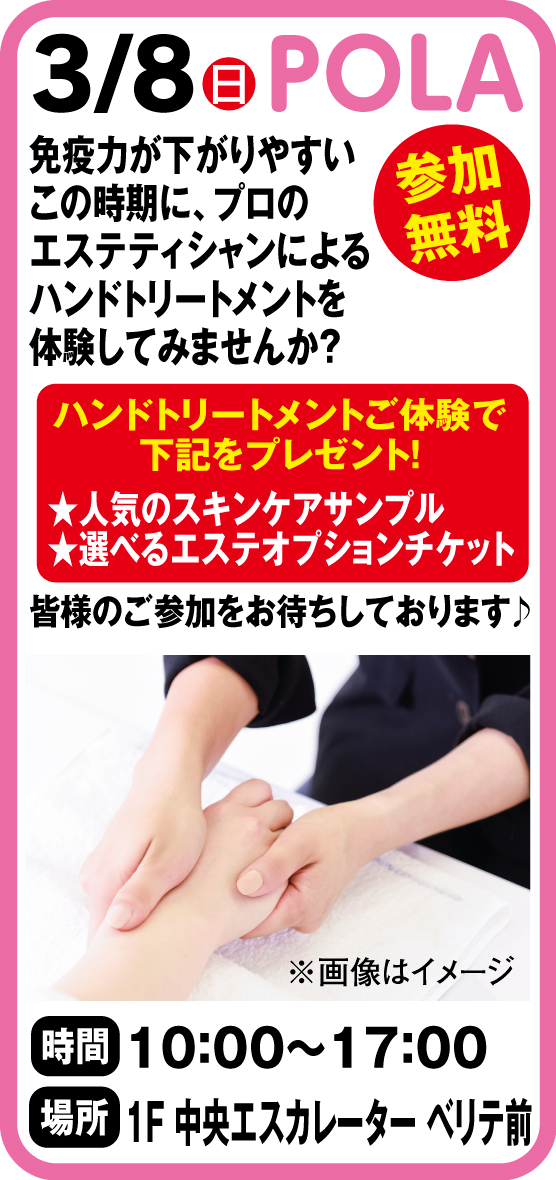 ■時間:10:00~17:00 ■場所: 1F中央エスカレーターベリテ前 参加無料 免疫力が下がりやすいこの時期に、プロのエステティシャンによるハンドトリートメントを体験してみませんか?ハンドトリートメントご体験で下記を…
