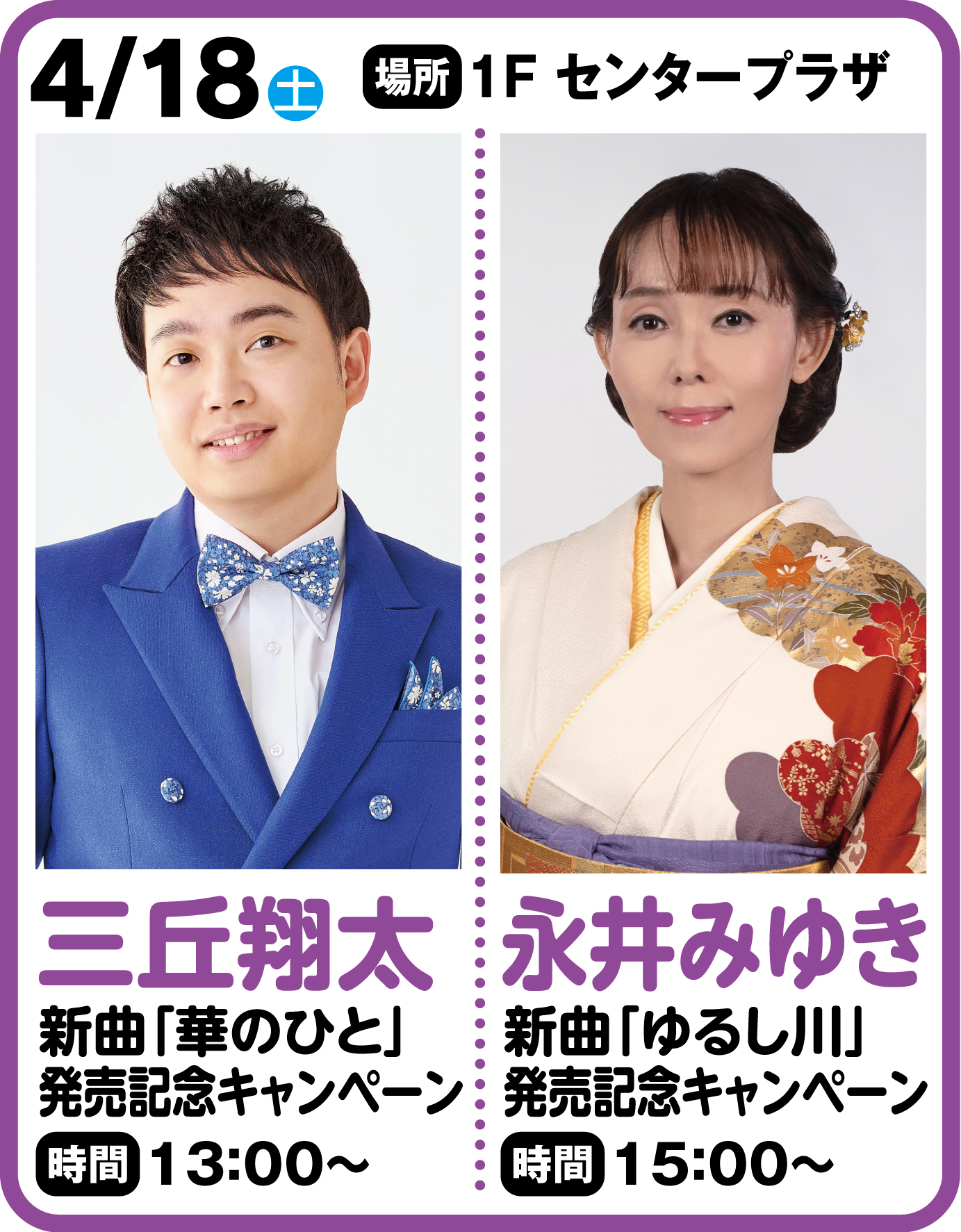 華のひと」発売記念キャンペーン ◆日程: 2026年4月18 日(土) ◆会場:千葉・ユアエルム成田 1Fセンタープラザ (千葉県成田市公津の杜4丁目5−3) ◆時間:13:00~ ◆内容:ミニライブ、特典会(サイン会&…