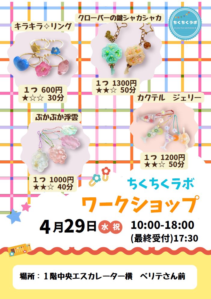『ちくちくラボ』ワークショップ GWスペシャル 《日時》4月29(水・祝)10:00~18:00 (最終受付17:30です) 《場所》1階中央エスカレーター横 ベリテさん前 UVレジンを使ってオリジナルのアイテムを作るワ…