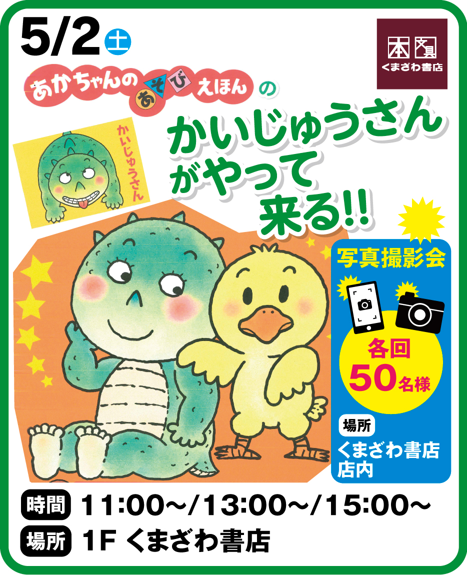 5/2(日) くまざわ書店 あかちゃんのあそびえほん かいじゅうさん写真撮影会(くまざわ書店) 各回50名様 時間:11:00~/13:00~/15:00~ 場所:くまざわ書店店内 皆様のご来店を心よりお待ちしております…