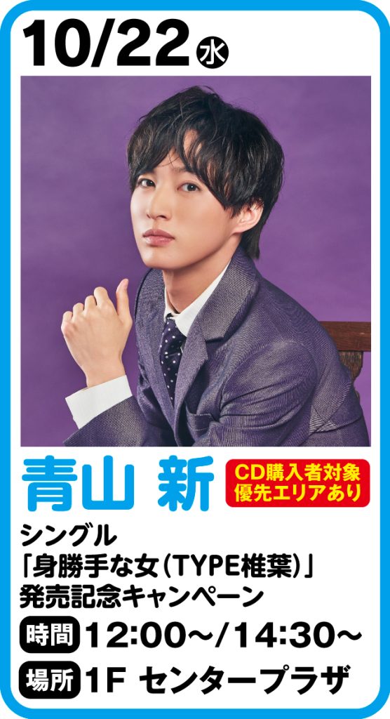 ※イベント当日、10:00より会場CD売り場にて対象商品をご購入(ご予約)いただいたお客様には、<整理番号入り優先入場券>と、ご購入枚数に応じた<特典券>をお渡しします。