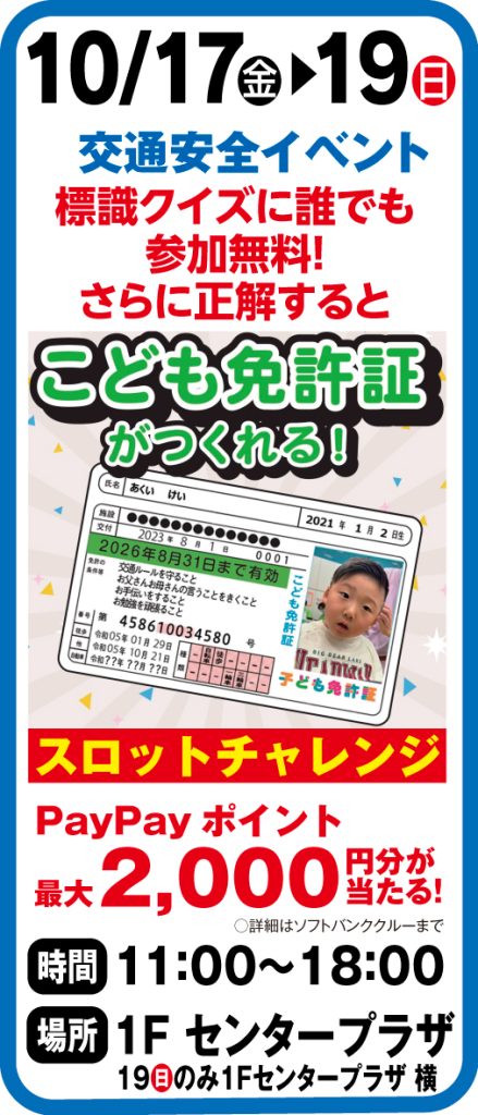 10/17~19 ユアエルム成田1Fセンタープラザにてこども免許証イベントを開催致します☆