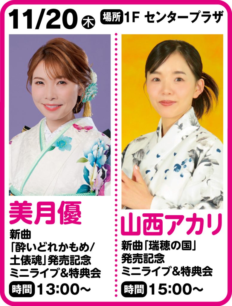ミニライブの観覧はフリーとなりますが、ステージ前の着席観覧エリアは定員に達した場合入場制限を設けさせていただきます。またイベント当日、会場にて美月優の対象関連商品をご購入いただいたお客様に特典券を差し上げます。特典会参加券をお持ちの方はご購入枚数に応じて歌唱終了後行われるサイン会+2ショット撮影会にご参加いただけます。