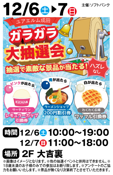 開催日:12月6日(土)10:00~19:00・7日(日) 11:00~18:00会場:1Fセンタープラザ大好評のガラガラ抽選会を開催!抽選にて・・・☆サーティワンアイスクリーム様レギュラーカップ1個 引換券☆ラーメンショップ様200円割引券☆わくわく広場様ワッフル1個 引換券などなどが当たります♪♪外れた方にも・・・?参加券は上記対象店舗でお買い物をされた方にお渡ししています。是非奮ってご参加下さい☆詳しくはこちらから
