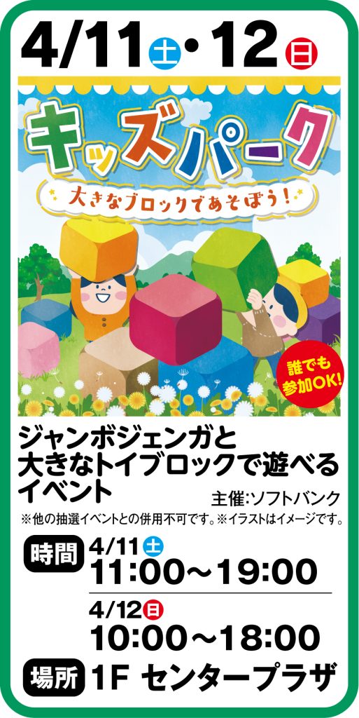 【内容】ジャンボジェンガと大きなトイブロックで遊べるイベント【開催時間】4/11(土)→11時~19時4/12(日)→10時~18時【みんな集まれ!】是非1階センターコートまでお気軽にお立ち寄りください!