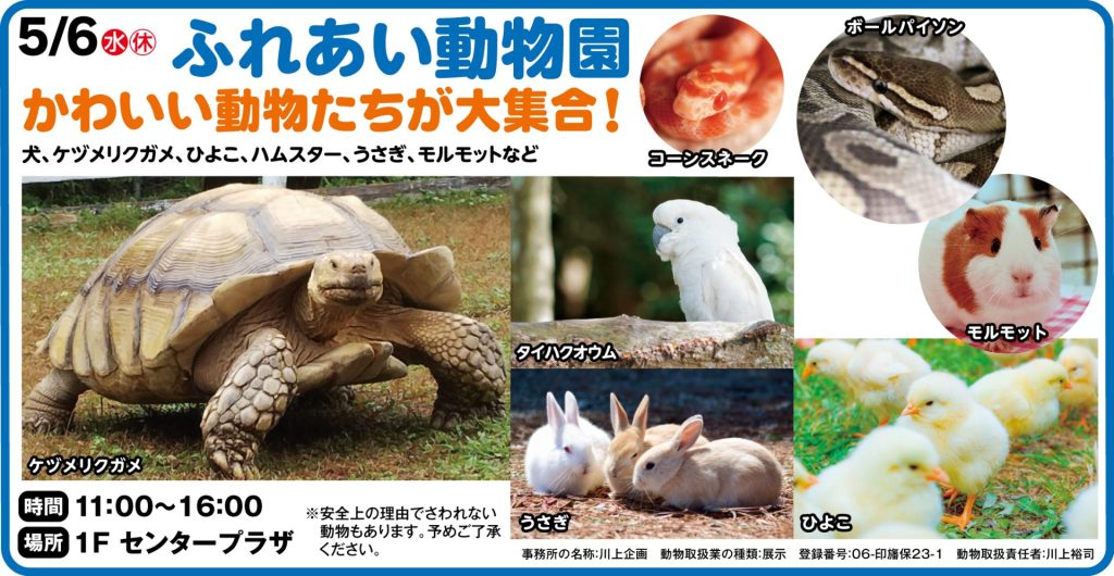 かわいい動物たちが大集合!犬、ケヅメリクガメ、ひよこ、ハムスター、うさぎ、モルモットなど■場所:1階 センタープラザ■時間:10:00~18:00※安全上の理由で触れない動物もあります。予めご了承ください。