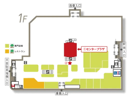 各種イベントスペースとしてお貸出しいたします① センタープラザ■スペースサイズ:16.2メートル × 17.7メートル センタープラザ見取図② 1F中央エスカレーター ベリテ前③ B1F中央エスカレーター前