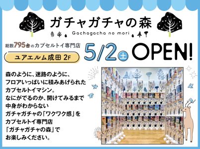 ガチャガチャの森が2階にオープン!森のように、迷路のように、フロアいっぱいに積みあげられたカプセルトイマシン。なにがでるのか、開けてみるまで中身がわからないガチャガチャの「ワクワク感」をカプセルトイ専門店「ガチャガチャの森」でお楽しみください。