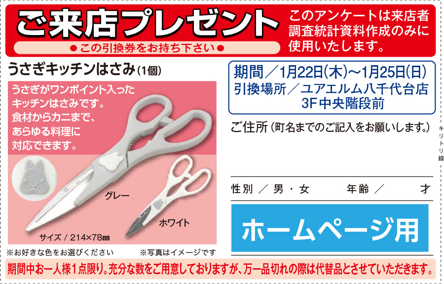 このページをプリントアウトし、アンケートご記入の上、ユアエルム八千代台店の引換場所にお持ちください。 うさぎキッチンはさみ(1個)を差し上げます!