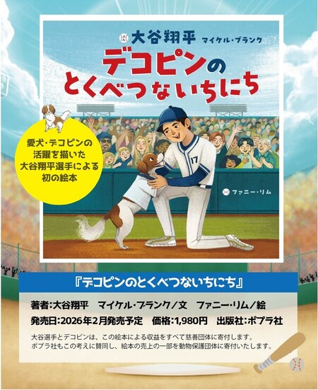 また、大谷選手とデコピンは、この絵本による収益をすべて慈善団体に寄付します。ポプラ社もこの考えに賛同し、絵本の売上の一部を動物保護団体に寄付いたします。